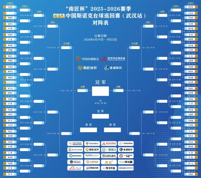 4月19日至23日,持续关注“南匠杯”2025-2026赛季CBSA中国斯诺克台球巡回赛(武汉站) ,共同见证新一代职业资格的诞生,书写中国斯诺克台球运动高质量发展的新篇章。