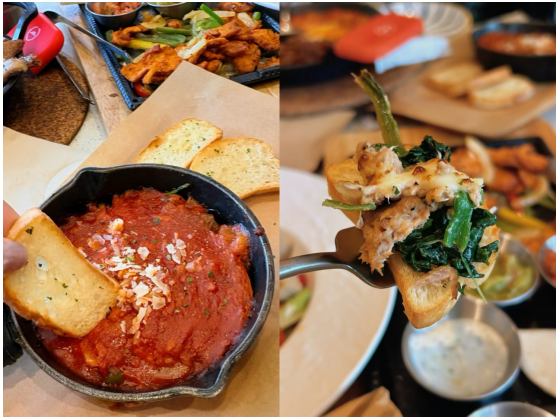 意式金枪鱼慕斯绿野菠菜塔帕斯,则是开胃菜中的优雅之选。绵密金枪鱼肉,慕斯质感一抹丝滑,搭配清新菠菜碎,再加上拉丝的马苏里拉芝士,经焗烤后外层金黄焦脆,内里柔滑涌动,口感层次丰富。