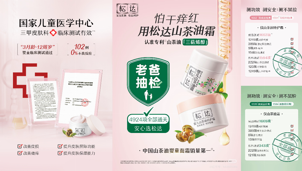 从三十多年前为解决孩子红疹而寻得的马尾松花粉,到后来深入研究、将“东方液体黄金”山茶油确立为核心成分,再到如今针对现代婴幼儿复杂肌肤问题(反复的干、痒、红)研发出的山茶油特护霜,松达产品的演变轨迹,清晰地勾勒出一部中国家庭育儿智慧与需求的进化史。