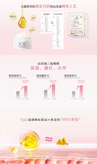 理性时代的安心,离不开可验证的科学语言。品牌依托自建的天鑫研究院,长期深耕山茶油成分,尤其攻克了三萜烯醇的检测与活性保留的行业难题,实现其含量在成品中的高浓度稳定。7项山茶油国家发明专利,覆盖从原料鉴别到生产全流程,构建了牢固的技术壁垒。