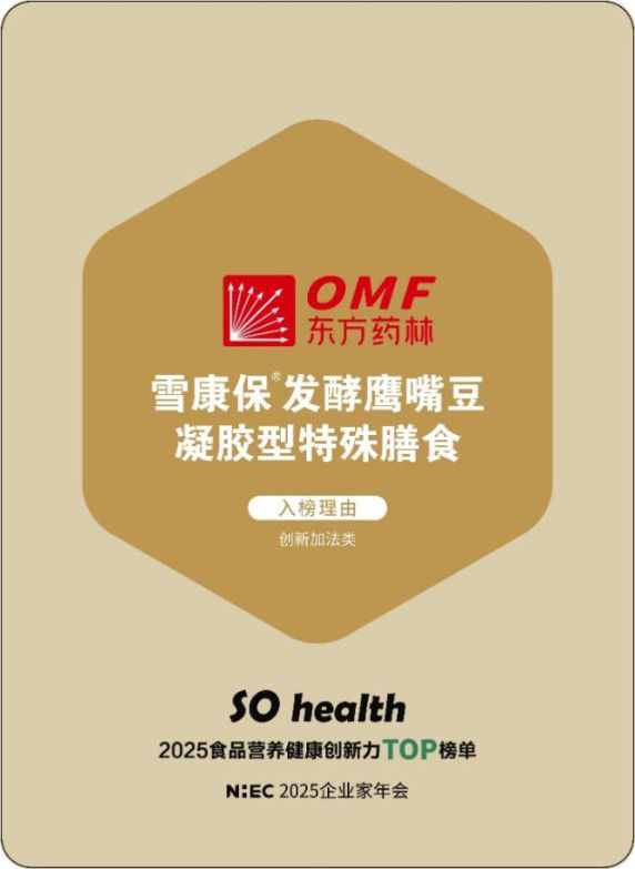 近日,在由中国保健协会主办的“SO health 2025食品营养健康创新力TOP榜单”评选中,东方药林药业有限公司研发的“雪康保®发酵鹰嘴豆凝胶型特殊膳食”凭借其在剂型创新与航天生物技术融合方面的突破,从众多参赛产品中脱颖而出,成功入选该权威榜单。