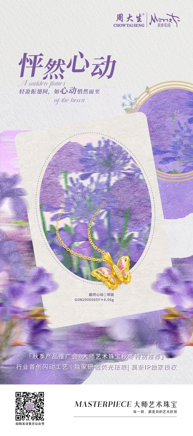 从灵动的蝶翼颤动到浪漫的色彩变幻,周大生莫奈Monet艺术臻品始终践行 “每一刻,都是你的艺术时刻” 的品牌理念。它打破了艺术与生活的壁垒,用创新工艺让光影有了动态,让色彩有了情绪,让每一件珠宝都成为传递美感的载体。无论是日常佩戴彰显格调,还是作为礼物传递心意,周大生莫奈Monet都能以艺术的温度,陪伴佩戴者在平凡日子里,邂逅不凡的美学体验,让光影为翼,艺境随身。